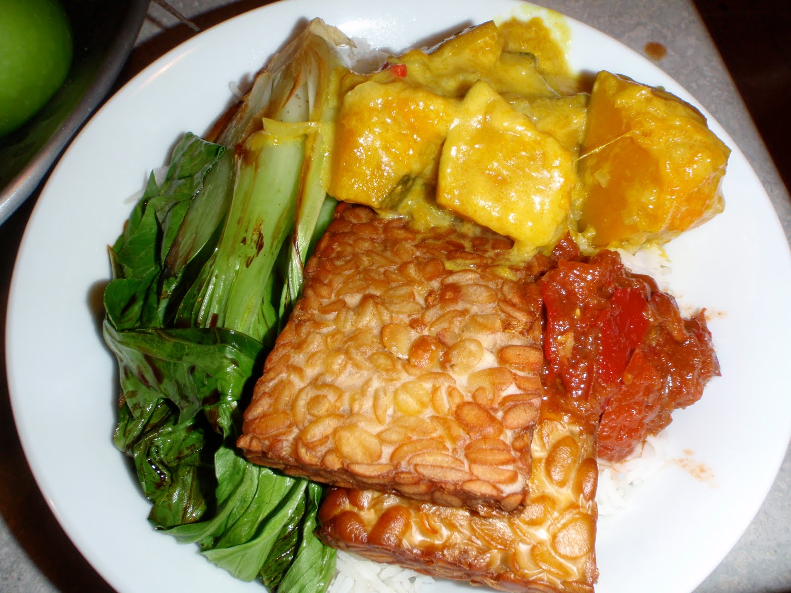 At its base are boiled long beans, spinach, potato, corn, egg and bean sprouts coupled with cucumber, tofu and tempe.